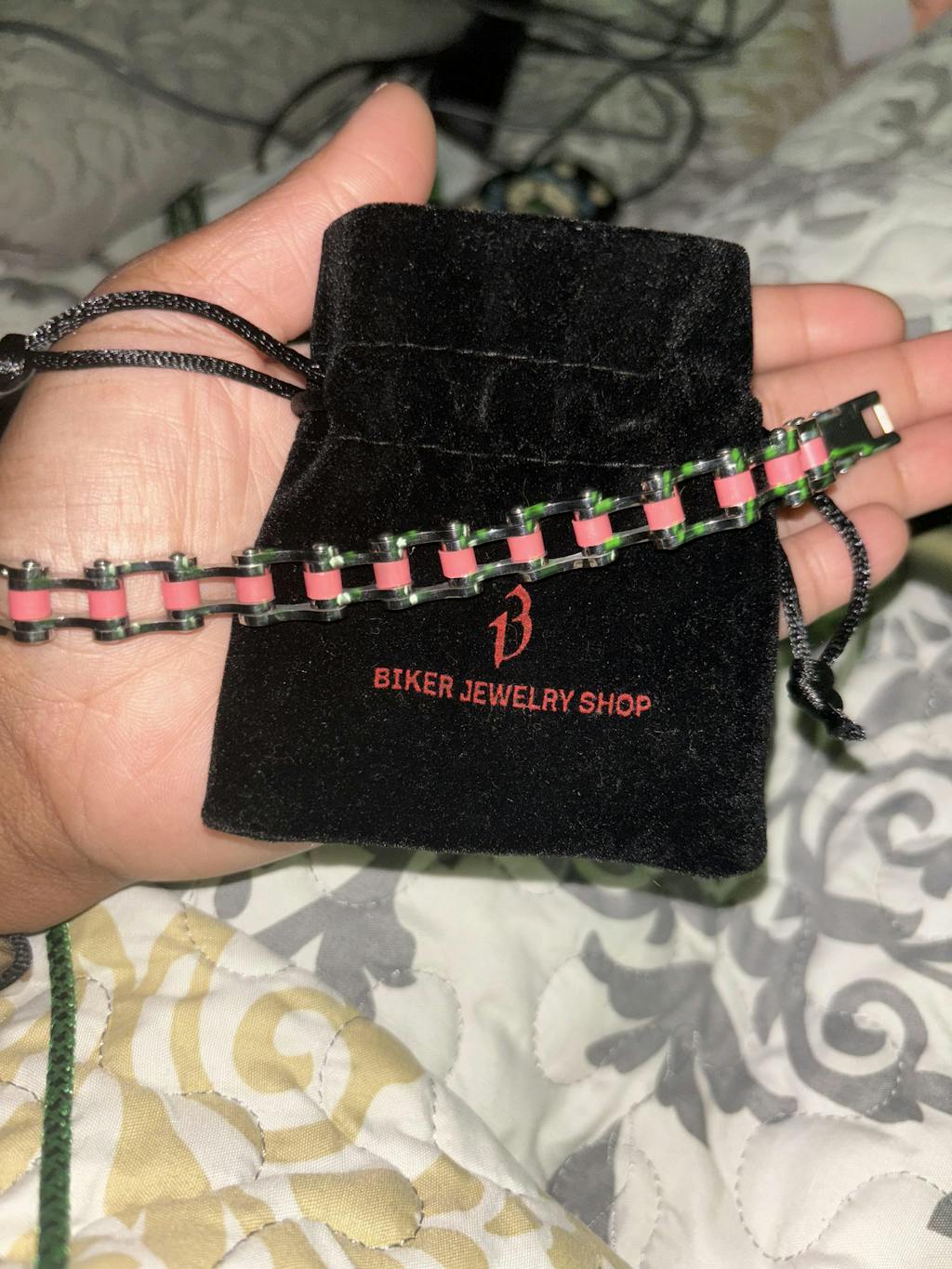 The Stainless Steel And Pink Women's Bike Chain Bracelet from our Biker Collection is made of premium stainless steel that offers enhanced durability, even after exhaustive every day wear on the road. The unique motorcycle bike chain bracelet design combined with polished silver and pink finishes make the silver and pink bike chain bracelet the perfect accent for everyday outfits and more. This Motorcycle Bike Chain Bracelet features a slim chain width of .39 inches. Wear your new Stainless Steel And Pink Bike Chain Bracelet without worry in the water or while you sweat, all jewelry from Biker Jewelry Shop is made to last!